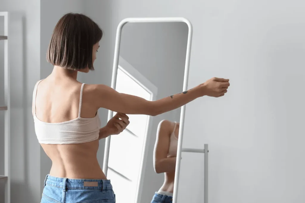 Certaines personnes anorexiques continuent à se voir « trop grosses » malgré une maigreur évidente. Elles peuvent passer des heures à se regarder, à se comparer, à se mesurer.
