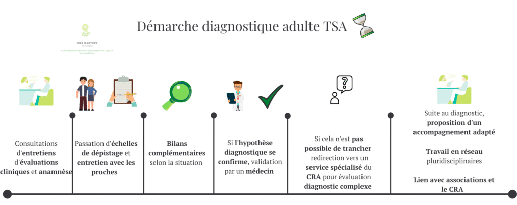 Le diagnostic comprend plusieurs étapes : un entretien approfondi sur les antécédents, des observations comportementales et parfois des questionnaires standardisés. Le processus peut durer plusieurs semaines et implique généralement une équipe pluridisciplinaire (psychologues, pédopsychiatres, orthophonistes).